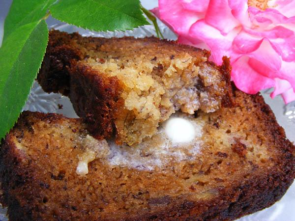 Moist and tender sweet bread full of ripe bananas and covered in chopped walnuts.